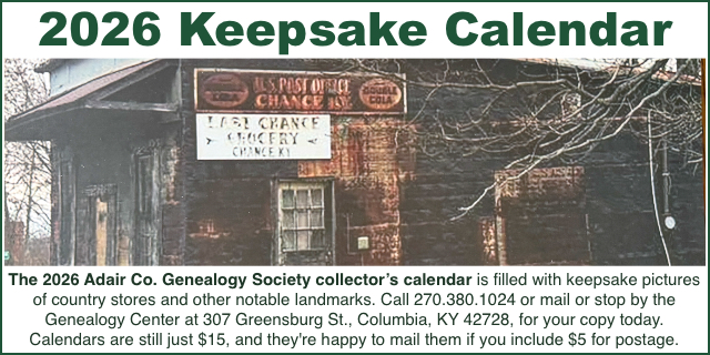 The Adair County Genealogical Society is offering its 2026 Historic Pictures Calendar. Primarily showcasing general and country stores around the county, it also includes images featuring other notable locations, such as the Circle R and some local post offices.
