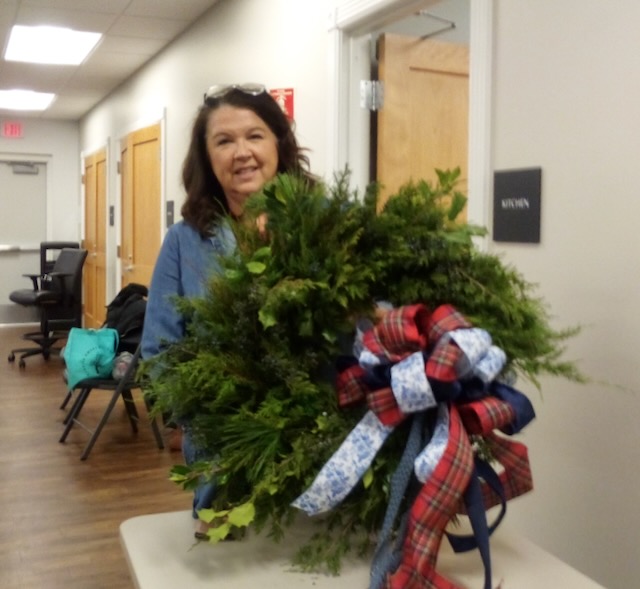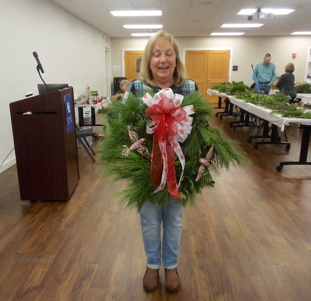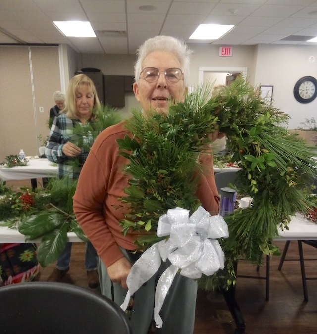 Glenda Smith shows off her wreath creation at the Homemakers Wreath Making Class on Thursday.