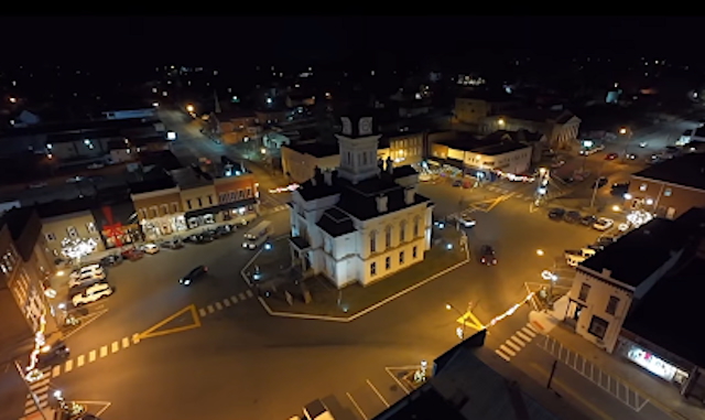 This quiet holiday scene of the historic Adair County Courthouse and public square at night was shared by Mayor Pam Hoots. Leading traffic from the courthouse - Jamestown Street goes off the square to the lower left and Greensburg Street to the right. Burkesville Street and Campbellsville Street go off the square at the top and bottom right.