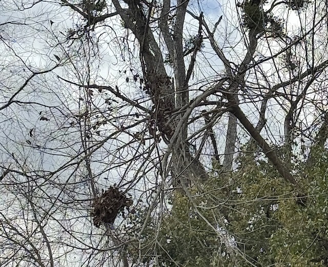 Mistletoe, like that on the upper limbs in this picture, grows onto tree limbs, but squirrel's nests, lower left, are architectural marvels that hang on because they are built to. Materials used to construct them are twigs & branches, leaves and vines, human litter like plastic bags or paper, soft fibers, moss and grass, shredded bark and leaves, fur and feathers and acorns and nuts. The nest has multiple entrances.