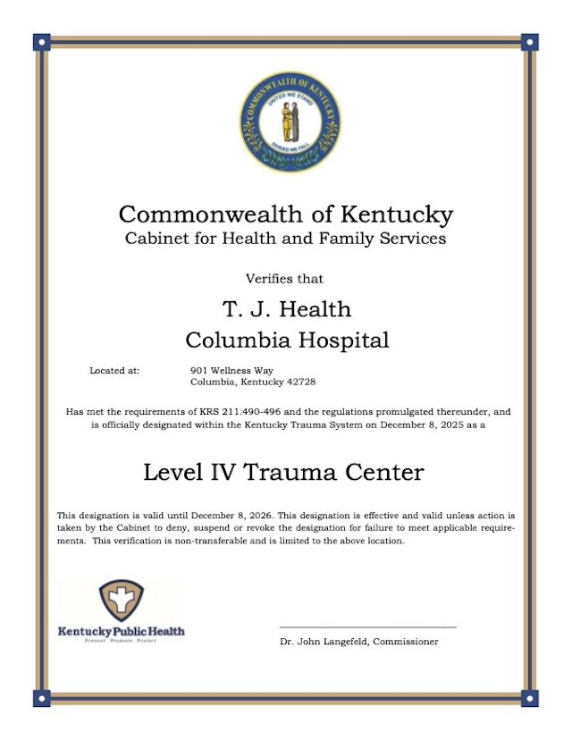 TJSCH/TJ Health Columbia earn Trauma Center designations From Stacey Biggs Glasgow, KY - T.J. Regional Health proudly announces that T.J. Samson Community Hospital and T.J. Health Columbia have each been officially designated as Level IV Trauma Centers, marking a historic milestone as the first trauma-designated hospitals in South Central Kentucky. The Level IV Trauma Center designation was awarded through the Kentucky State Trauma Care System (KSTCS) under the oversight of the Kentucky Cabinet for Health and Family Services (CHFS) and the Office of the Commissioner, Department for Public Health. The designation confirms that both hospitals meet the Commonwealth's rigorous standards for trauma readiness, including staffing, education, performance improvement, and coordination with emergency medical services. "This designation is an important milestone for our hospitals and the communities we serve," said Ashley Ritter, Trauma Program Coordinator for T.J. Regional Health. "It reflects the dedication of our emergency department teams and strong collaboration with EMS partners. I am proud of what we have accomplished and look forward to continuing to strengthen and enhance trauma care locally." As Level IV Trauma Centers, T.J. Samson Community Hospital and T.J. Health Columbia are equipped to provide 24/7 trauma evaluation and stabilization, ensure rapid assessment of injured patients, and coordinate transfers to higher-level trauma centers when needed. This designation enhances the region's trauma care network and improves outcomes by ensuring critically injured patients receive the right care at the right time. "The Level IV Trauma Center designation underscores our ongoing commitment to high-quality, compassionate care and to meeting the evolving healthcare needs in south central Kentucky," said Neil Thornbury, CEO. "We are strengthening the trauma services across our region and improving access to lifesaving care for patients who depend on us." Click here to share, print, or bookmark this article. 2026-01-16 08:46:25 | Comments | See topic Health Care