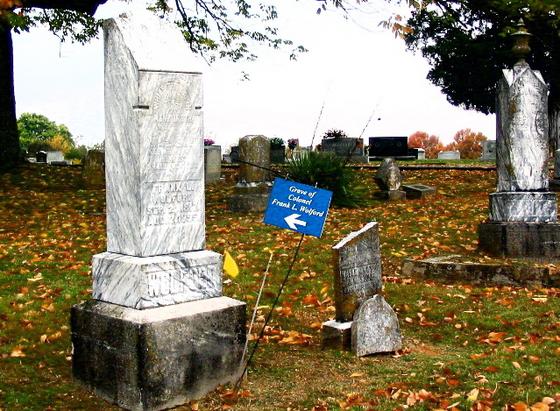 2005-10-22 - Columbia, KY - Photo Staff. The grave of of Colonel Frank L. Wolford is in the Columbia City Cemetery. It is inscribed, "Whilst Earth Remaineth Seed Time and Harvest Shall Not Cease. Frank L. Wolford, Sep. 2, 1817, Aug 2 , 1895. WOLFORD." The marker is in the section of the cemetery closest to town, and facing Campbellsville ST. The roof tops in the background would be on Wall Street.