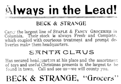 The ad for Beck & Strange shown here appeared in the December 20, 1905 Adair County News; it constituted one-third of the Christmas-specific advertising in that edition of the paper. Of the other two, one was a terse text-only announcement from M. Cravens, who ran a drug and notions store, while the other touted Singer Sewing Machines as "the best gift Christmas gift for wife, mother, daughter, sister or sweetheart." (The ad didn't name the agent or give a location, but a news brief from earlier in the year reported that Mr. W.L. Taylor, the local Singer representative, had rented the little green brick building in the east corner of the square and that he would "keep a good supply of machines on the market." Mr. Taylor had hired Miss Julia Eubank to run the office for him.) When Beck & Strange--brothers-in-law S.W. Beck & Conrad "J.C." Strange--opened in the fall of 1903, the location was given as "the Bram Vaughan corner."