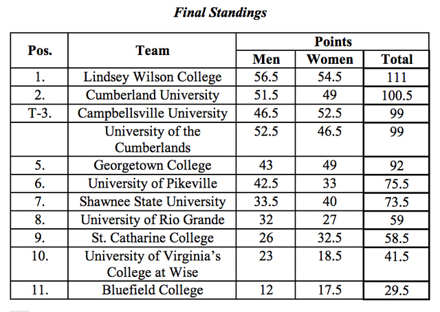 Lindsey Wilson wins second straight MSC President's Cup Cumberland University finishes second; Campbellsville University is third Click on headline for complete story with chart By Chris Wells News from Lindsey Wilson College LOUISVILLE, KY -- For a second straight season, Lindsey Wilson athletics has won the Mid-South Conference President's Cup. The Blue Raiders scored 111 out of a possible 120 points to capture the Cup for the 2012-13 academic year. The point total is the third highest in Mid-South history. Article continues... click title or click here to read whole article. 2013-05-06 18:18:58 | Comments | Printable version | See topic Sports
