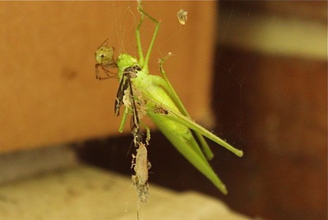 Life in the Holler: Ending up something's supper An essay, a life lesson Click on headline for item with photo(s) The difference an hour can make. A fellow (I named Hopper) was hanging out minding his own business. Hopper was having a pretty decent day. Got his picture taken and was about to be famous, but unbeknownst to him or the photographer, a spider (I named Viper) had other plans. Yet, if you look at the situation from the view of the Viper, he ending up having a great day! He was lucky enough to catch enough food to feed himself for a week. Guess it all depends on whose view you like on something as to whether something is horrible or a blessing. 2013-08-11 15:43:47 | Comments | Printable version | See topic Shamarie Claiborne - Life in the Holler