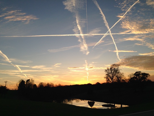 The sky was filled with so many contrails from so many flights over Adair County this evening that my Mom couldn't count them as we traveled home from Pellyton where hundreds gathered for the burial of Daniel Ellis. She thought the stunning way they lingered against the flaming sunset might be a hopeful message from God to his family. -- LMW
