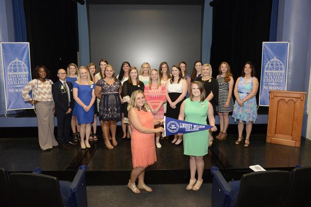The Lindsey Wilson College Nursing Division honored its 21 seniors on Thursday, May 12, 2016, with a pinning ceremony in V.P. Henry Auditorium on the A.P. White Campus. The 21 seniors - who later received a Bachelor of Science degree in nursing on Saturday, May 14 from the liberal arts college - received a lapel pin from the college's nursing faculty to symbolically welcome them into the nursing profession. Front row, from left: Hannah Gupton of Summersville, KY; Lauren MacKenzie Smith of Somerset, KY.Middle row, from left: Tiera Glover of Radcliff, KY; Grant Edlin of Elizabethtown, KY; Adena Lucas of Cecilia, KY; Abigayle Colon of Columbia, KY; Sarah Shell of Danville, KY; Kristina Cundiff of Russell Springs, KY; Cheyenne Bolin of Danville, KY; Samantha Robertson of Russell Springs, KY. Back row, from left: Haylee King of Richmond, KY; Ashley Jeffries of Columbia, KY; Whitney Redmon of Columbia, KY; Shannon Trent of Columbia, KY; Rebecca Smith of Russell Springs, KY; Jessica Courtney Clyde of Hodgenville, KY; Kacey Smallwood of Cecilia, KY; Lauren Janes of Columbia, KY; Darrian Dalton of Albany, KY; Amanda Evans of Dunnville, KY. - Travis Smith