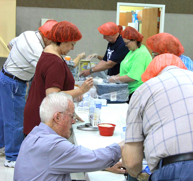 Raymond Martin, Val Adams, Dick and Kim Scholl, unrecognized Bill Skaggs, Gene Grasham, and Carol Miller, work as a team doing a giant share of the effort needed for 55 people to pack 1,580 meals in 1.5 hours at the Columbia Christian Church on Saturday, June 11, 2016. - Tim Johnson, Discipleship Leader at the Columbia Christian Church