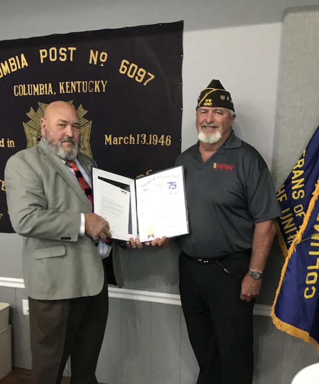 VFW 6097 awarded 75-Year Certificate By Joe Hare At the Department of Kentucky, District 8, VFW meeting at Columbia Post 6097 on Sunday, April 18, 2021, three posts in the district were presented certificates for their 75 years of continuous existence and service to community and veterans. These VFW posts are: