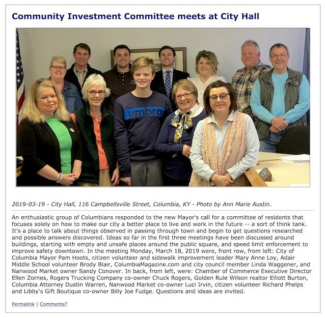 Contact us: Columbia Magazine and columbiamagazine.com are published by Linda Waggener and Pen Waggener, PO Box 906, Columbia, KY 42728. Please use our contact page, or send questions about technical issues with this site to webmaster@columbiamagazine.com. All logos and trademarks used on this site are property of their respective owners. All comments remain the property and responsibility of their posters, all articles and photos remain the property of their creators, and all the rest is copyright 1995-Present by Columbia Magazine. Privacy policy: use of this site requires no sharing of information. Voluntarily shared information may be published and made available to the public on this site and/or stored electronically. Anonymous submissions will be subject to additional verification. Cookies are not required to use our site. However, if you have cookies enabled in your web browser, some of our advertisers may use cookies for interest-based advertising across multiple domains. For more information about third-party advertising, visit the NAI web privacy site.