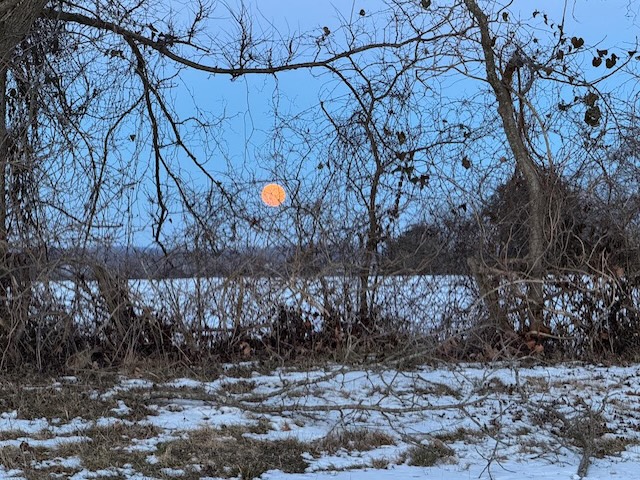 This huge full moon was seen over snowy fields looking out from the Ag building on the school campus.