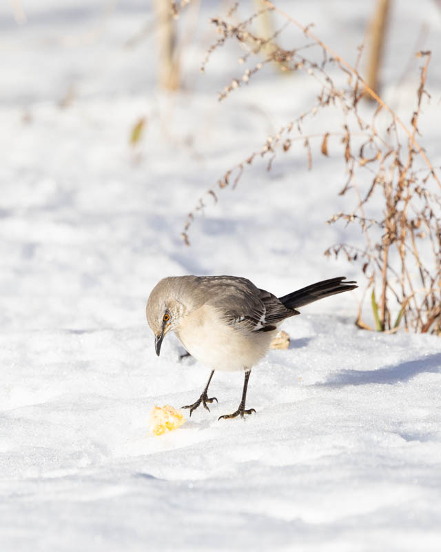 A Northern Mockingbird inspects a piece of fruit left out with assorted bird seeds in an area park during the days after Winter Storm Fern.