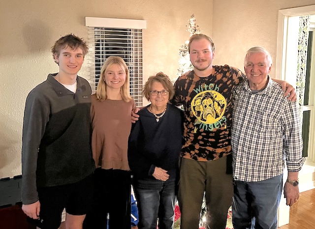 Carol and Guy Perkins traveled to Austin for a late Christmas with their grandkids. Pictured, left to right, are Noah, Eme, Carol, Luke and Guy.