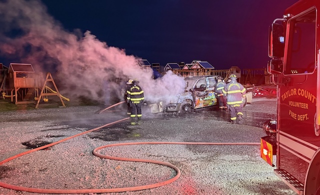 Monday evening, 2-23-2026, the Taylor County Firefighters were dispatched to a vehicle fire at Backyard World on New Lebanon Road, Campbellsville. Upon arrival units found a truck heavily involved in the engine and passenger compartment. A second truck that was parked nearby sustained minor heat damage. Twelve firefighters and two apparatus responded.