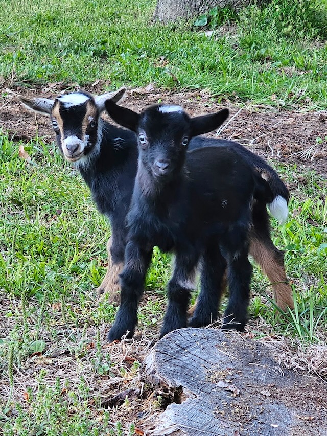 Donna writes, "Precious' week-old girls came out of the barn for the first time on Saturday evening's walkabout down to the creek. There's so much to explore (and taste!) for a couple of curious kids!"