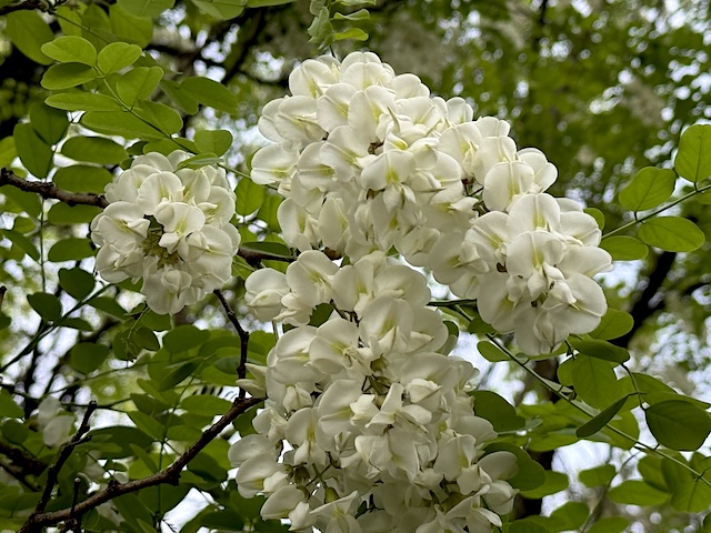 Black Locust tree limbs are heavy with aromatic blossoms this year. The intensely fragrant, edible white flowers bloom in drooping clusters each spring. The tree itself is a key nectar source for honey production.