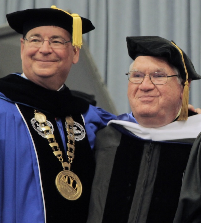 Former Lindsey Wilson University Director of Library Services Phil Hanna (1951-2024), right, pictured with Lindsey Wilson President William T. Luckey Jr. in 2017.
