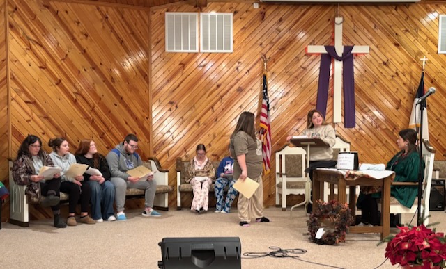 A surprise guest rehearsing for the Adult class presentation of the play "Bloomington's Ole Homeplace" at Bloomington Chapel Church on Sunday evening, December 14, 2025. Comments | Permalink Teens rehearse for Christmas Play