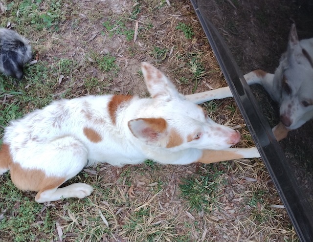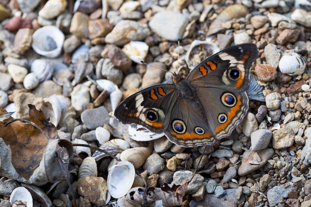 A buckeye butterfly spotted on a dry creek gravel. Butterflies can get minerals and sodium from dry or nearly dry gravel. Comments | Permalink Dog still in search of owner
