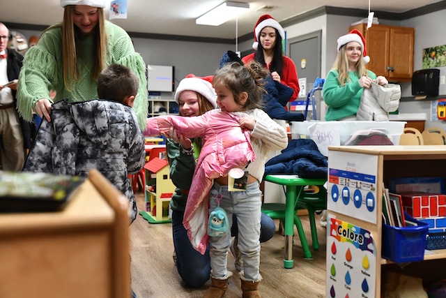 Lindsey Wilson University students Jay Woodall '27 of Somerset, Kentucky, left, and Emmalee Miller '27 of Louisville, Kentucky, help students try on their new winter coats that were donated by the LWU Bonner Scholar Program's "Coats for Kids" on Wednesday, December 10, 2025. In the last 14 years, "Coats for Kids" has given more than 700 coats to Adair County Head Start students. Comments | Permalink Jay Woodall delivers toys to Head Start