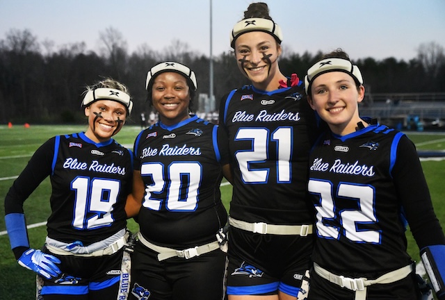 Lindsey Wilson University women's flag football players, from left, freshman Amaya Pablo of Pace, Florida, junior Ashten Dickerson of Pace, Florida, freshman Demi Serman of Auburndale, Florida, and freshman Carlee Yokley of Tompkinsville, Kentucky, gather before the start of the first women's flag football home game in LWU history on Friday, March 13, 2026, at Parnell Family Stadium. Lindsey Wilson beat Campbellsville University 40-13 to improve to 4-1 in their inaugural season. The Blue Raiders play their next home game on April 1, 2026. Comments | Permalink Older Photos