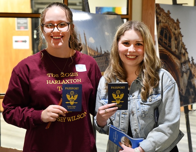 Lindsey Wilson University physics professor Mark McKinnon and Sierra Coe, Jim and Helen Lee Fugitte Science Center laboratory coordinator, helped organize the tour of Harlaxton College, a Victorian manor in England's East Midlands that is available for a semester-long study experience. The tour was held on Wednesday, October 29, 2025, in the J.L. Turner Leadership Center. Comments | Permalink Harris and Black with passports