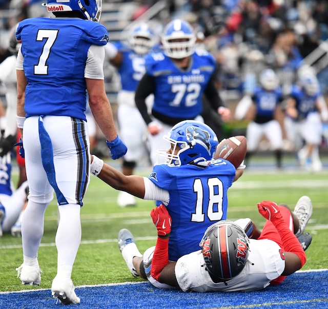 Lindsey Wilson University junior wide receiver Taborie Reed of Pinson, Alabama, celebrates a 6-yard touchdown pass from Tate Rice of Manchester, Kentucky, to give the Blue Raiders a 43-31 lead over Indiana Wesleyan University in the second round of the NAIA Football Championship Series on Saturday, November 29, 2025, at Parnell Family Stadium.