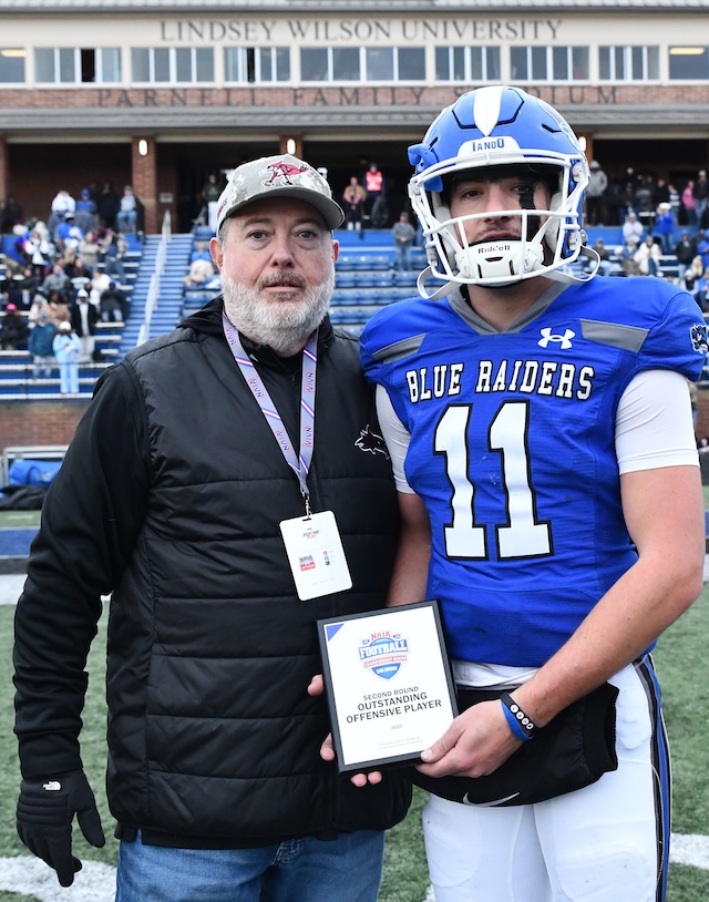 Lindsey Wilson University sophomore quarterback Tate Rice of Manchester, Kentucky, is presented the NAIA Offensive Player of the Game award by NAIA game official and Cumberland (Tennessee) University football coach Tim Mathis following the second round game of the NAIA Football Championship Series on Saturday, November 29, 2025, at Parnell Family Stadium. Rice threw for a career-high 382 yards on 22 of 35 passes with four touchdowns. Comments | Permalink Reed celebrates touchdown