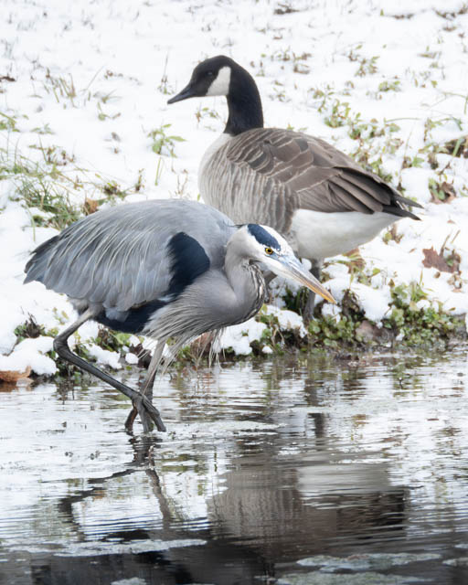 A great blue heron fishing on a snowy afternoon, unbothered by a Canada goose. Comments | Permalink Older Photos