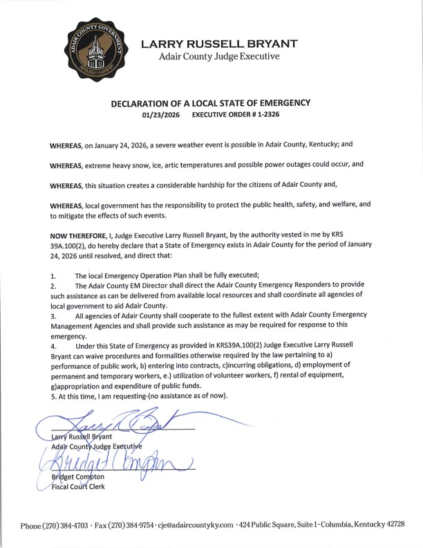 A State of Emergency has been declared for Adair County following a visit today from Kentucky Emergency Management (KYEM) Area Manager Justin Graves to Judge Executive Larry Russell Bryant.