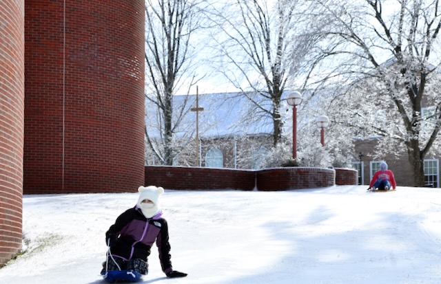 Lindsey Wilson University student Breanna Turnbaugh '29 of Louisville, Kentucky, uses a lid for a plastic tub to sled down the hill next to the John B. Begley Chapel on Monday, January 26, 2026. The weekend's winter storm closed Lindsey Wilson offices and canceled classes on Monday. Comments | Permalink Sledding on Lindsey Hill