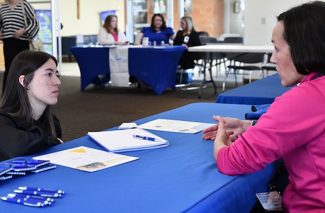 Lindsey Wilson University nursing student Kaylyn Smith '26 of Campbellsville, Kentucky, left, speaks with Dana Meiklereid, senior recruiter with Norton Healthcare Human Resources of Louisville, Kentucky, at the LWU Nursing Fair, held Friday, February 27, 2026, at the university's Norma and Glen Hodge Center for Discipleship. Comments | Permalink LWU Nursing Program reports another successful year