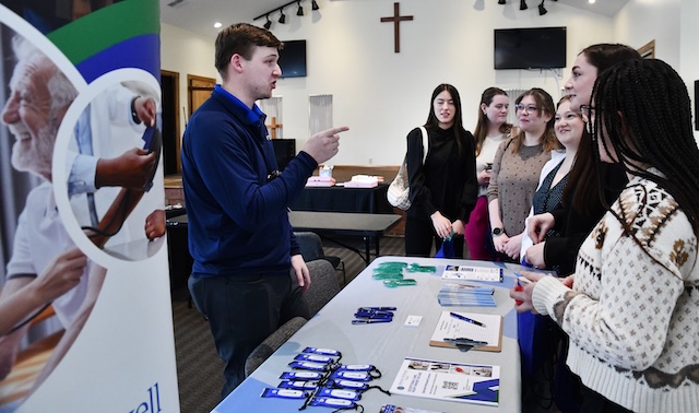 Mitchell Wiese, a talent acquisition specialist with Ephraim McDowell Health of Danville, Kentucky, speaks with Lindsey Wilson University nursing students at the LWU Nursing Fair, held Friday, February 27, 2026, at the university's Norma and Glen Hodge Center for Discipleship. Comments | Permalink LWU Nursing Fair held February 27