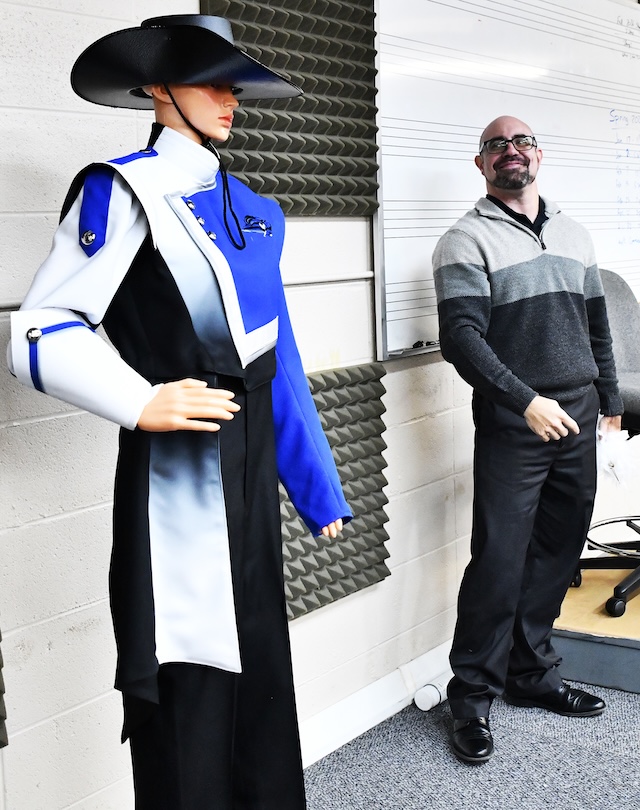 Lindsey Wilson University Director of Bands Robert Palmer discusses the band's new uniform during the private reveal to band members on Wednesday, March 18, 2026, in the Blue Raider Band Building.