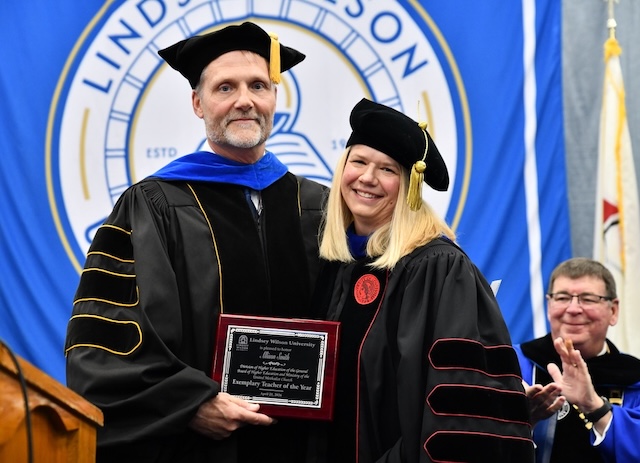 Lindsey Wilson University Director of Education Dr. Jennifer Antoniotti-Neal, left, presents the Outstanding Academic Achievement in Art Education Award to Hallee Coffey '27 of Edmonton, Kentucky, at the university's annual Honors Convocation, held Tuesday, April 21, 2026, at Biggers Sports Center. Comments | Permalink LWU Global Citizens Club honored
