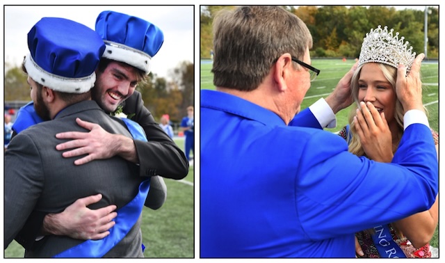At left Lindsey Wilson University Cody Shepherd '27 of Mount Juliet, TN, receives a hug from 2024 Lindsey Wilson Homecoming king Zachariah Lawson '26 of Williamsburg, KY, after being crowned 2025 Homecoming king during halftime of the LWU-Faulkner (Alabama) University football game on Saturday, October 25, 2025, at Parnell Family Stadium. Shepherd, who is a business administration major, represented the Student Government Association.