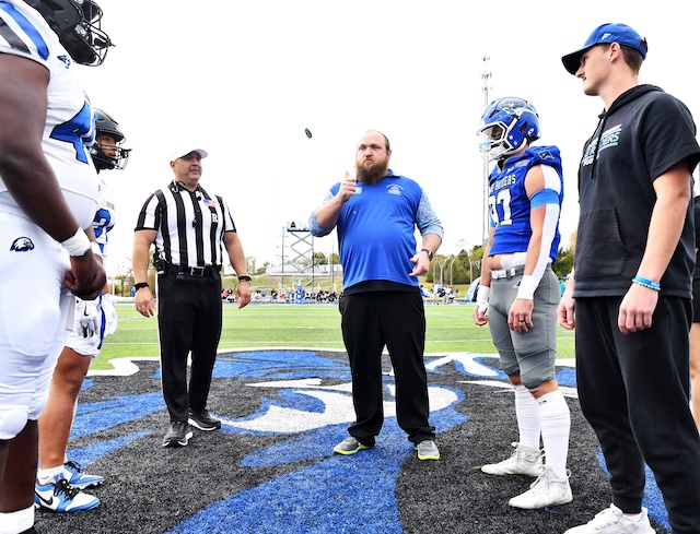 Lindsey Wilson National Alumni Association President Tanner Strein '14 flips the coin to determine which team will receive the kickoff to start the LWU-Faulkner (Alabama) University football game on Saturday, October 25, 2025, at Parnell Family Stadium. Tanner is a former Blue Raider football player. Comments | Permalink LWU Homecoming King and Queen 2025