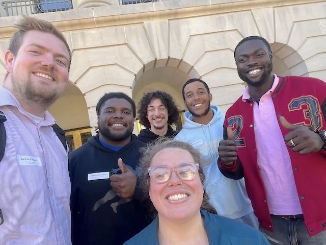 Lindsey Wilson University communication faculty member Katelyn Brooks takes a picture outside of the Kentucky Capitol on an October 9, 2025, field trip to the state capital.