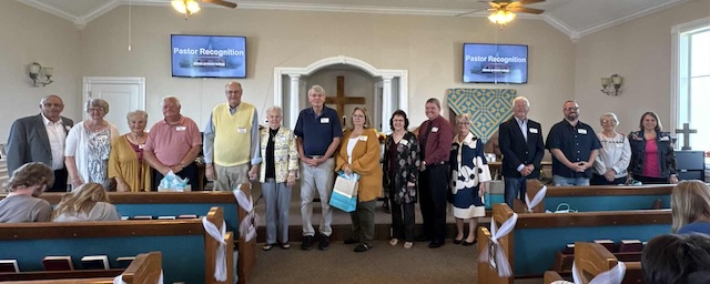 Pictured are the pastors and/or their families that were in attendance (left to right): Brother Russell Janes 1975-1978 and wife Dee Janes, Pat Turner and Brother Terry Turner 1981-1985, Brother Vernon Perdue 1971-1975 and wife Mary Perdue , Doug Lyons (son of Stanley Lyons 1969-1971), Deborah Moon (wife of Mike Moon 2009-2010), Shellie Elmore and Brother Troy Elmore 2010-2020, Mrs. Carol Weddle 2022- present, Mike Hodges, Tony Hodges, and Cathy Dean (grandchildren of Reverend M.B. Hodges 1934-1940 1941-1954) and Jan Woody (daughter of Brother Paul Keneipp 1994-1996). Comments | Permalink Older Photos
