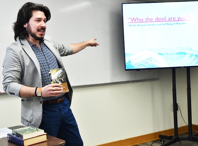 Lindsey Wilson University English professor Kendall Sewell discusses Herman Melville's novel "Moby-Dick; or, The Whale" in a recent meeting of his "American Literature I" survey class in W.W. Slider Humanities Center.