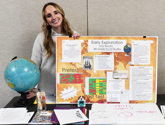 Lindsey Wilson University student Deric Shearer '26 of Nancy, Kentucky, discusses his research project, "Argumentative Essay Writing" for seventh grade students. Shearer presented his research in the Roberta D. Cranmer Dining & Conference Center during Lindsey Wilson's 2025 fall semester Academic Celebration Week. Comments | Permalink Natalie Jones presents research project