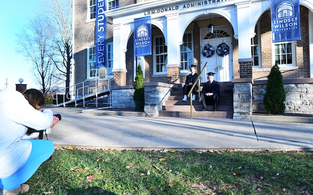 Lindsey Wilson University student Lilly Campbell '26 of Davenport, Iowa, takes graduation pictures of brothers Kaden Tibbitts, left, and Keegan, both of Simpsonville, Kentucky, on the afternoon of December 3, 2025, in front of the L.R. McDonald Administration Building.