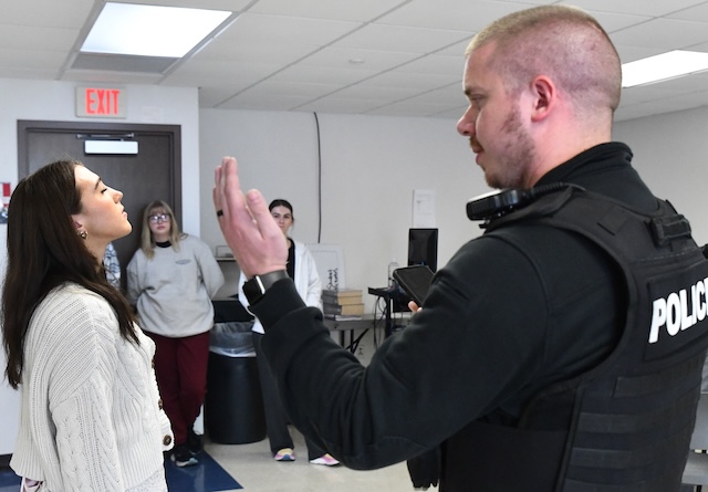 Columbia Police Elliot Smith administers a field sobriety test to Lindsey Wilson University student Hannaha Boyer '29 of Somerset, Kentucky, during an "Abnormal Psychology" class on Thursday, February 26, 2026, in the Dr. Robert and Carol Goodin Nursing and Counseling Center. Comments | Permalink Parrish tries a field sobriety test for Psychology class