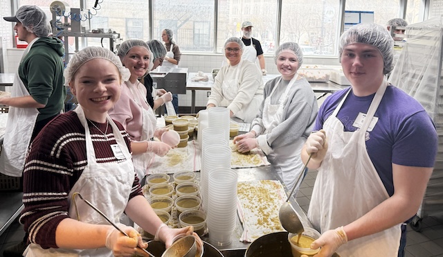 Pictured with Jones, alphabetically, are: Peyton Allen '27 of Louisville; Houston Cloud '27 of Lancaster; Director of Residence Life Bree Downs '24; Women's Resident Director Madison Duvall '24; Aimee Flynn '27 of Powell, TN; Jaden Latiola '28 of Radcliff; Eli McIntosh '27 of Bowling Green; Emmalee Miller '27 of Louisville; Cade Ramsey '27 of Russell Springs; and Ally Sanabria '28 of Auburn. Comments | Permalink Preparing meals for clients of God's Love We Deliver