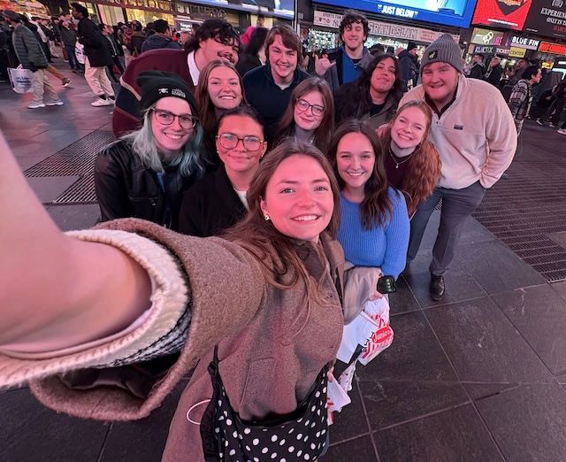 Lindsey Wilson University Women's Resident Director Madyson Jones '25 takes a picture of members of the university's residence life staff enjoying Times Square during their spring break, March 2-6, 2026. The group volunteered to serve at New York-based God's Love We Deliver, a 41-year-old nonprofit that delivers meals to people with severe illnesses.