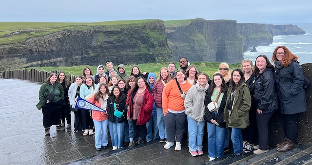Lindsey Wilson University faculty, staff and students gather at the Cliffs of Moher, which are in southwestern Ireland.