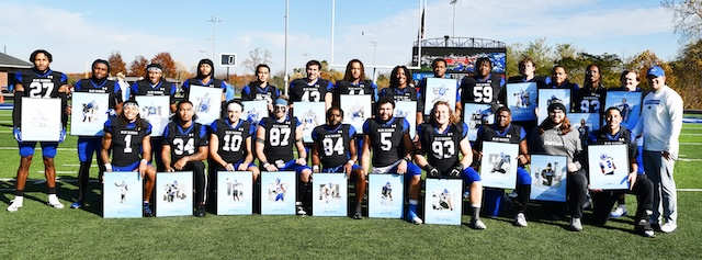 Lindsey Wilson University football coach Phil Kleckler, far right, joins his team's 24 seniors on Saturday, November 8, 2025, at Parnell Family Stadium. No. 9-ranked LWU beat Cumberland (Tennessee) University 56-37.