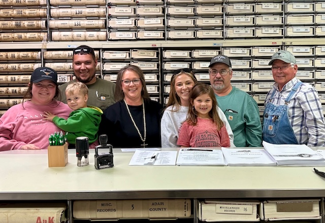 Gale B. Cowan has joined the primary field for Adair County Judge Executive, submitting paperwork on Thursday, November 6, 2025. Pictured with Cowan are her husband Jamie, Son and Daughter in Law Brady and Kara Cowan, daughter Beth Cowan, Grand children Baylee and Winfred, and father David Burris.