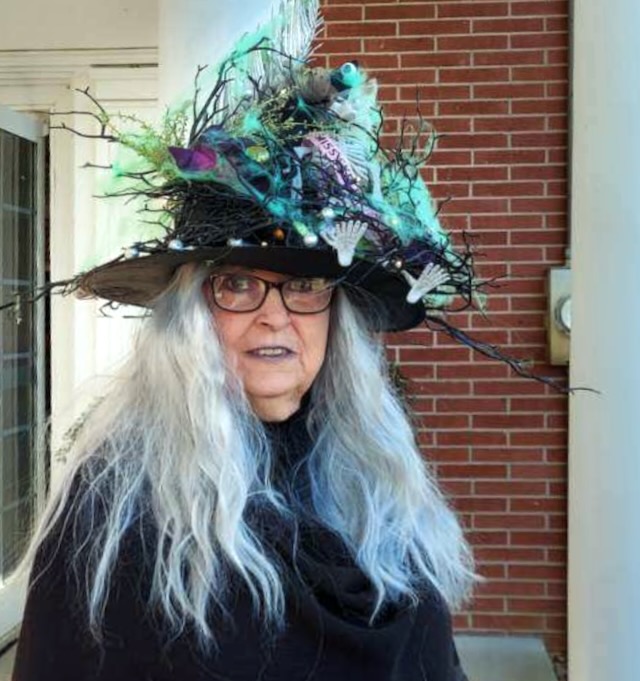 Carol Perkins poses above in her award-winning hat and grey wig, as declared by the owner of The Rex Family Restaurant in Nancy, KY, on a recent Halloween lunch.
