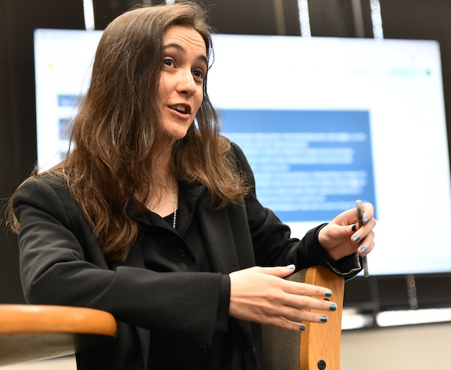 2025-11-26 - Columbia, KY - Photo courtesy Lindsey Wilson University. Lindsey Wilson University student Alannah Bowman '27, a business administration major from Columbia, responds to a question about her research, "'Our Weapon is Truth': Ukraine's United24 and Instagram Propaganda." Bowman discussed her research at the 2025 fall symposium of the R.V. Bennett Honors Program, held Tuesday, November 25, 2025, in the Thomas D. Clark Reading Room of the Holloway Building.